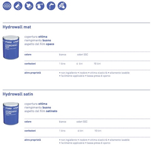 Il prodotto Hydrowall è idoneo per la verniciatura di ambienti con presenza di alimenti, come celle frigorifere, può essere utilizzato per pareti, soffitti e per tutte le superfici per le quali è richiesta la resistenza alla muffa. Il prodotto può essere lavato con sgrassante alcalino (comuni detergenti per casa).