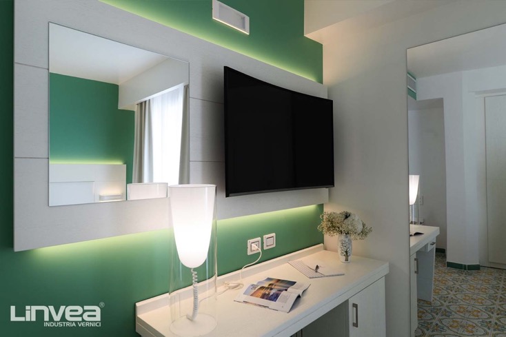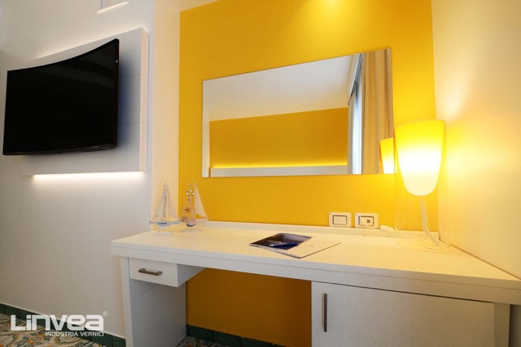 Gli elementi della tradizione sono stati collocati in ambienti che recuperano essenzialità e sobrietà attraverso il design delle camere innovativo e moderno, reso ancora più accogliente ed elegante dalla ricercata selezione delle tonalità dei colori che esaltano la scelta dei materiali degli arredi in legno di rovere sbiancato realizzati su disegno degli architetti. Grazie alle proprietà di Hydrowall Sanix, il design delle camere e dei bagni risulta più essenziale e sofisticato, senza rinunciare a scelte tonali di una certa personalità: giallo S1060-Y10R, verde S2030G e bianco sono i colori individuati per la nuova veste interna della struttura. Al di fuori delle camere, nei corridoi, è evidente l’utilizzo di M-K-SIL, colore: G60387, il nuovo rivestimento minerale a base di silicato di potassio ad effetto rasato fine (tipo marmorino), ad alta traspirabilità, applicabile a spatola e pennello.